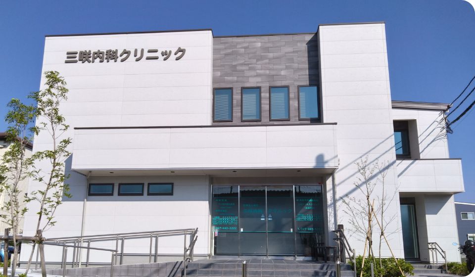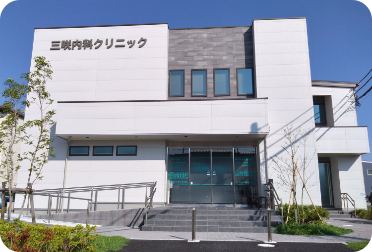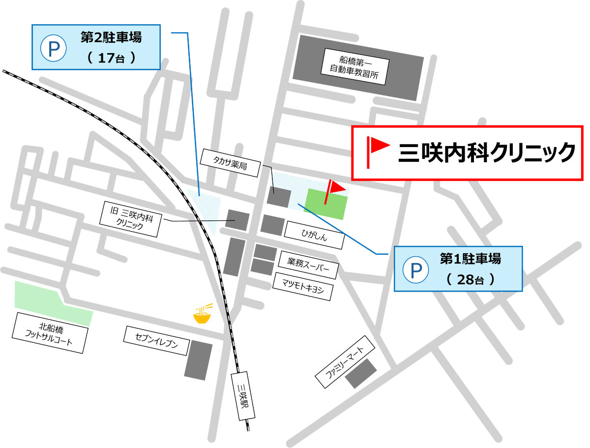 京成松戸線三咲駅より徒歩4分(改札を出て左手に戻るように階段を下りて駐輪場前の路地を踏切まで行って右折し、東京東信用金庫(三咲支店)を過ぎると、三咲内科クリニックの看板が見えてきます。クリニックは道路右側です。
