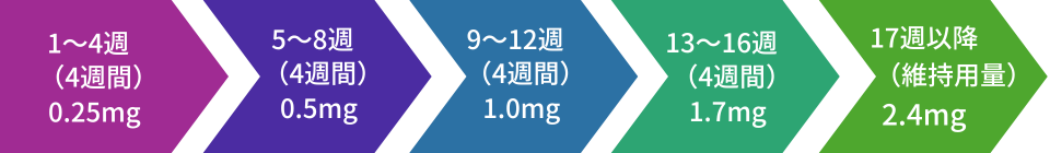 注射製剤の用量は5段階あり、胃腸障害の発現を軽減するために4週間隔で16週間かけて、段階的に増量していきます。なお、この注射製剤は68週で完了します。