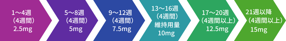 ※患者さんの病態に応じて4週間以上の間隔2.5mgずつ週1回15mgまで増量できます