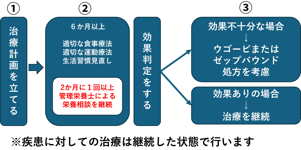 当クリニックは国の基準に基づく肥満症治療に係る施設基準適合医療機関です。当クリニックでは健康寿命を守り合併症を予防することを目的に、生活習慣改善支援を十分に行ったうえで保険診療内での肥満症治療薬(ウゴービ®・ゼップバウンド®)の処方も組み合わせた治療を行っています。