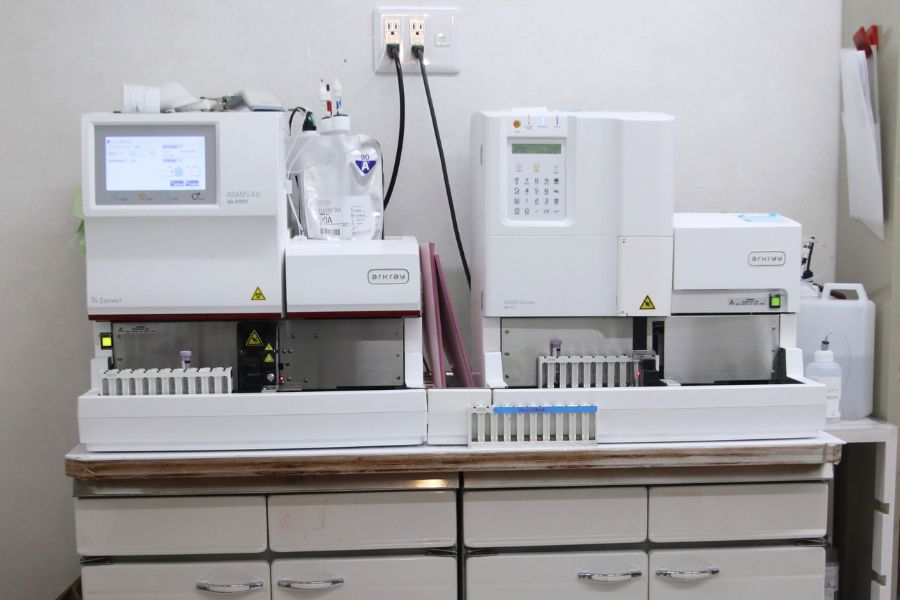 血糖値とHbA1cをその場で測定できる装置です。糖尿病の状態や治療効果をすぐに把握でき、診察中に結果をもとにした適切な治療方針の決定が可能です。