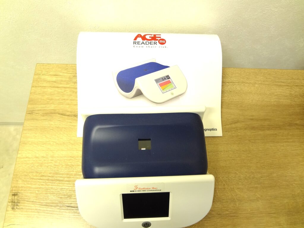 皮膚に光を当てて体内の糖化(AGEs)を測定する装置です。糖尿病や動脈硬化などのリスクを簡便に評価し、生活習慣の見直しに役立てます。ただし、保険適応がありませんので自費診療となります。